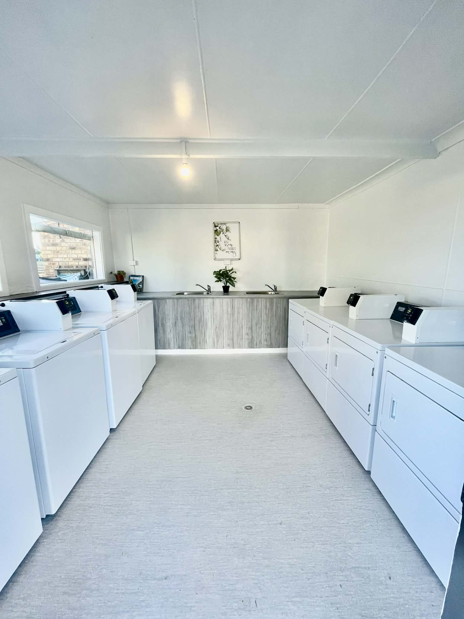 Fully functional coin operated laundry with 4 front loading washing machines, 2 dryers and clothes lines available. The laundry is available to travellers as well as park guests.